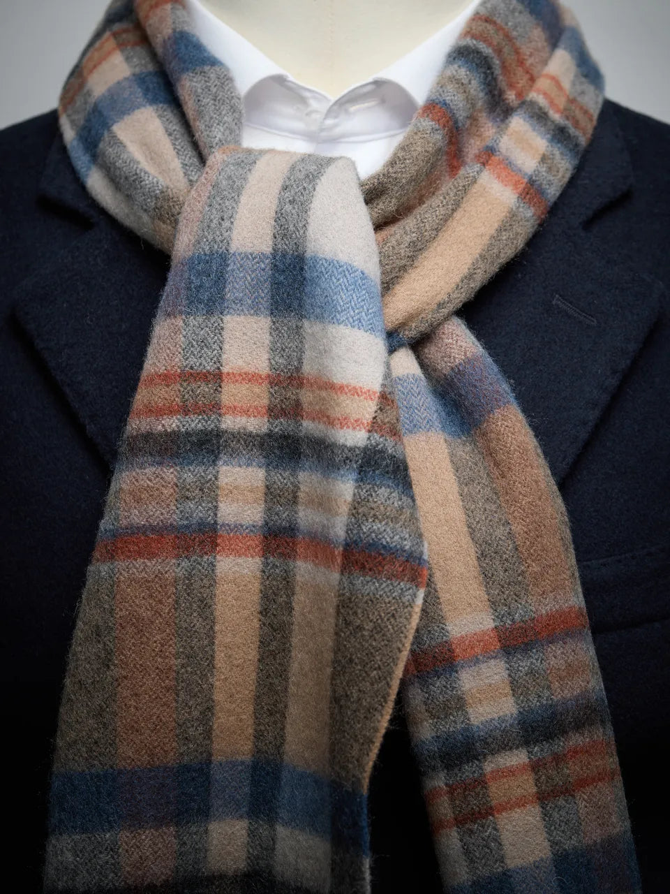 When wearing a scarf, it should be worn over your dinner jacket but below your lapel. When wearing wool, cashmere or alpaca, they can be worn knotted or wrapped around your neck.