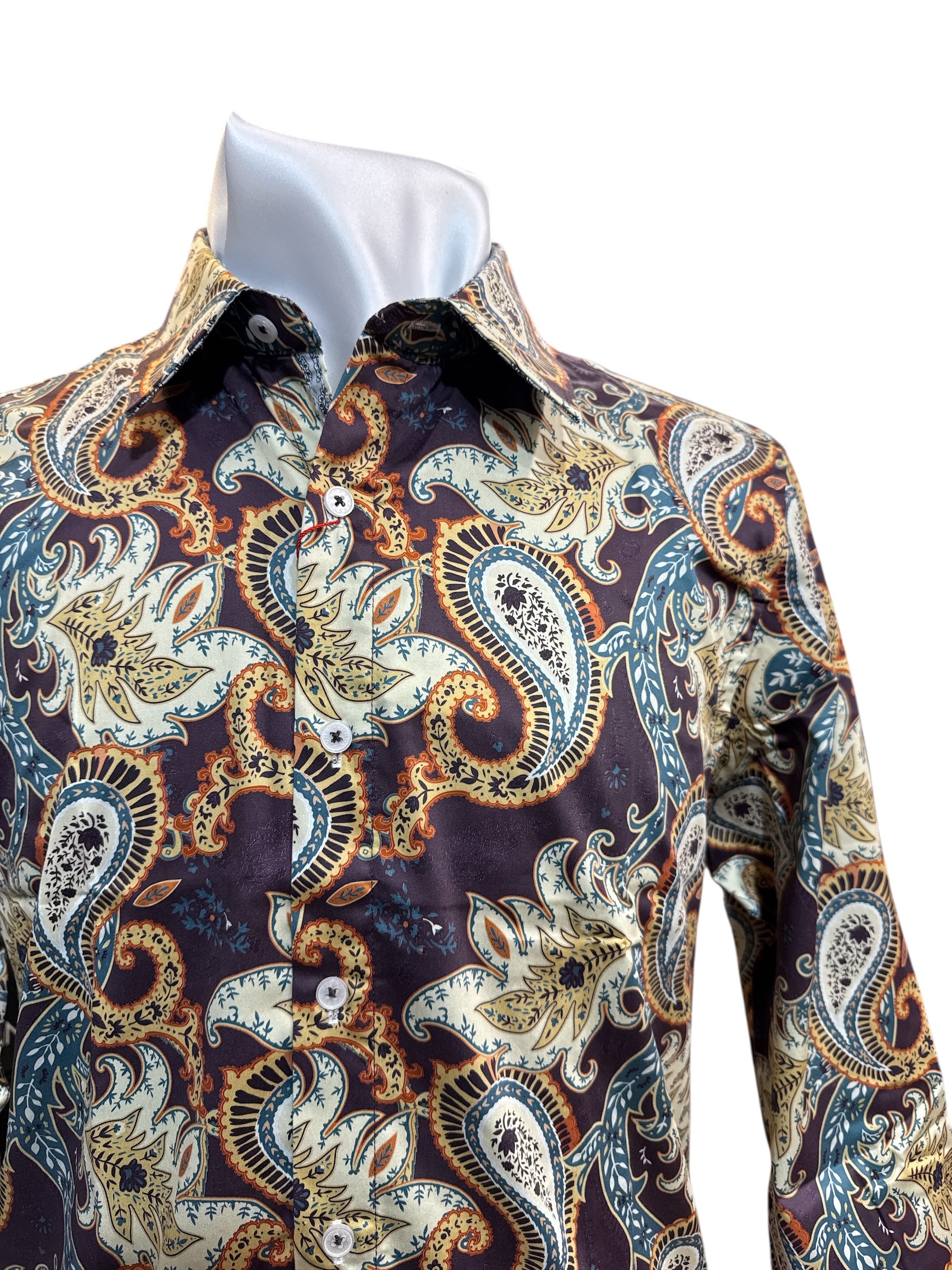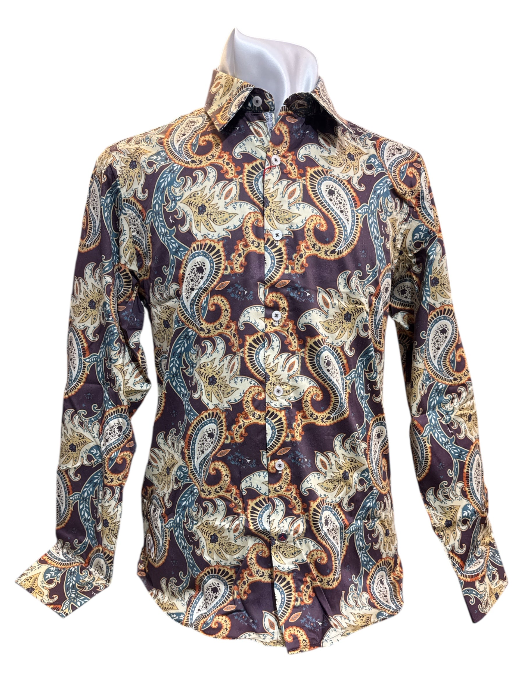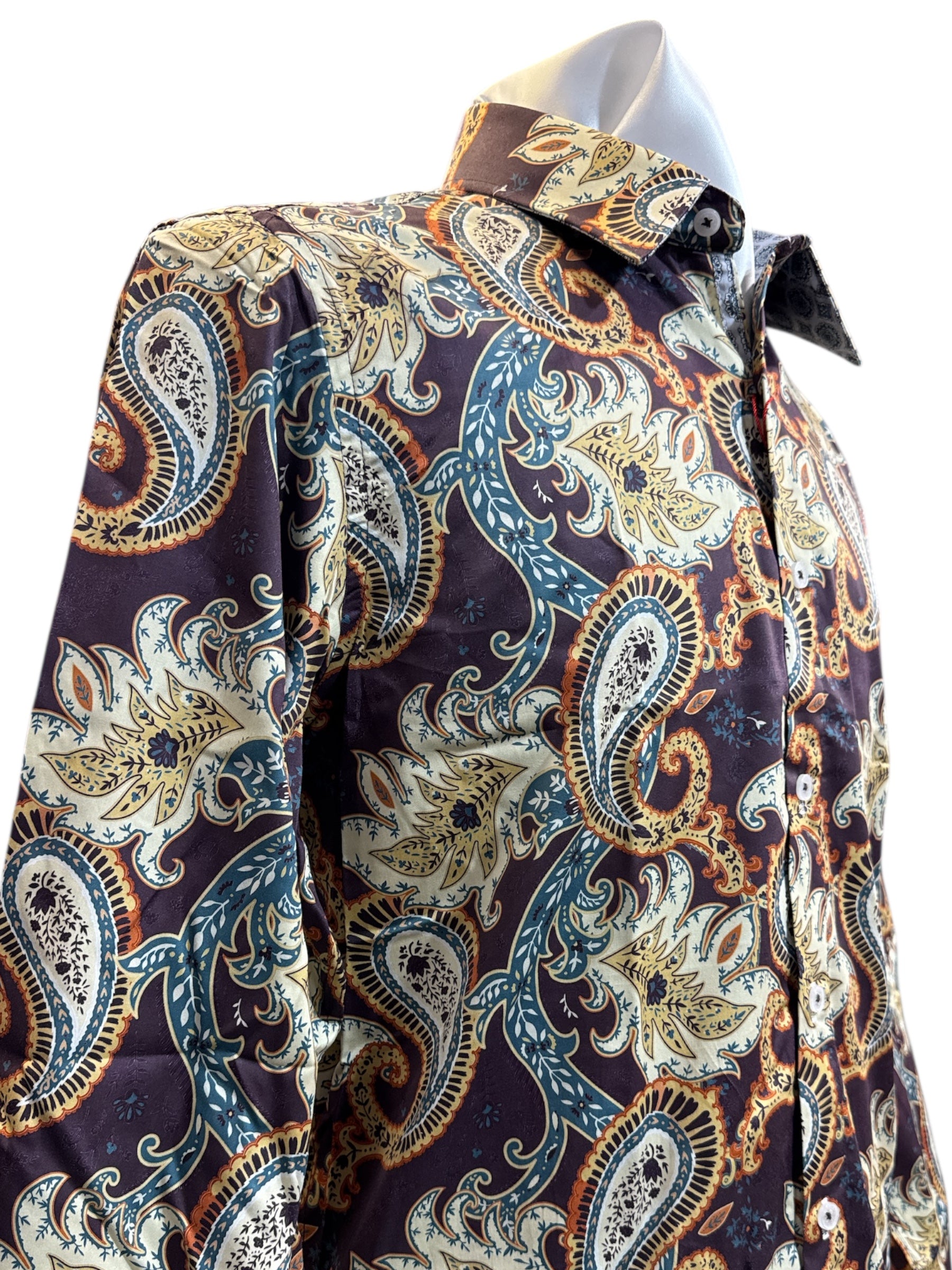 Step into the spotlight with the John Lennon Bradbury Shirt in Plum – a bold tribute to vintage rock ‘n’ roll style. Featuring an electrifying oversized paisley print in shades of cream, burnt orange, and teal, this shirt is all about making a statement without saying a word.